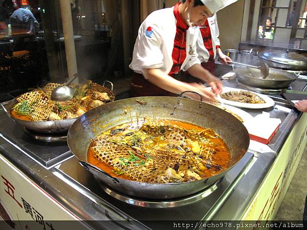 想起剛剛入座前,餐廳在座席區前擺了個灶台,灶上四口大鍋翻騰不斷的燒著鯉魚