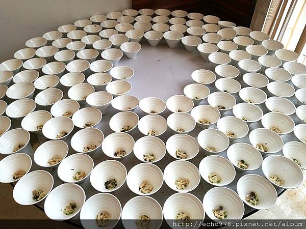 喜宴前,到處走走逛逛,看到一旁上菜的準備區,整整齊齊地擺著一會兒要喝的湯碗,裡面都備好料了!!
