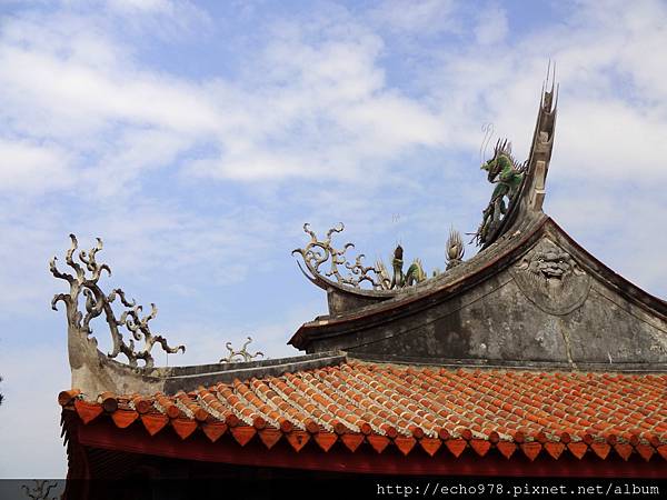 位在屋簷尾端的鯉魚翻躍的藻飾,向屋頂吐水,捲成一圈圈漣漪,非常生動,除了美觀外,也有防火消防之意